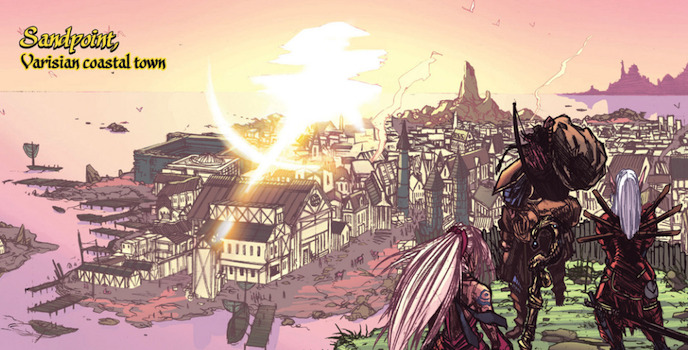 A simple, relatively peaceful town with all the color and common oddities one expects from a tightly knit community, Sandpoint sits at a point on the Lost Coast halfway between Magnimar and Windsong Abbey. Wood buildings and cluttered docks line the town’s natural harbor, while farms and the manors of wealthy citizens dot the surrounding countryside. During the day, fishing, farming, lumbering, glassmaking, and shipbuilding occupy most of the townsfolk, who commonly retire to their homes by way of Sandpoint’s many taverns. A playhouse and would-be museum make unusual attractions in such a small community, but Sandpoint’s true landmark is the Old Light, a lighthouse of ancient origins that lies in ruins.